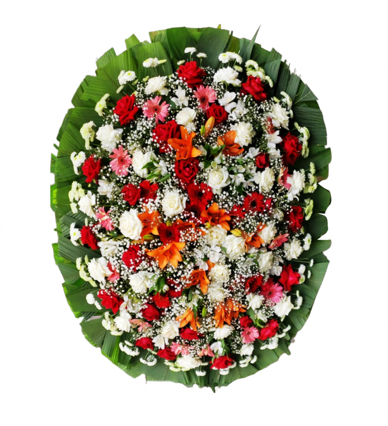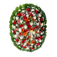 Com esta coroa de flores vermelhas, laranjas, brancas e rosas você poderá expressar os seus sinceros pêsames a família do falecido.