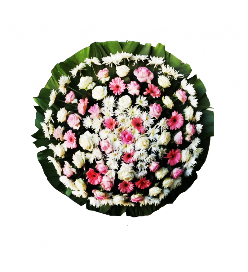 Com esta coroa de flores rosas e brancas você poderá expressar os seus sinceros pêsames a família do falecido.